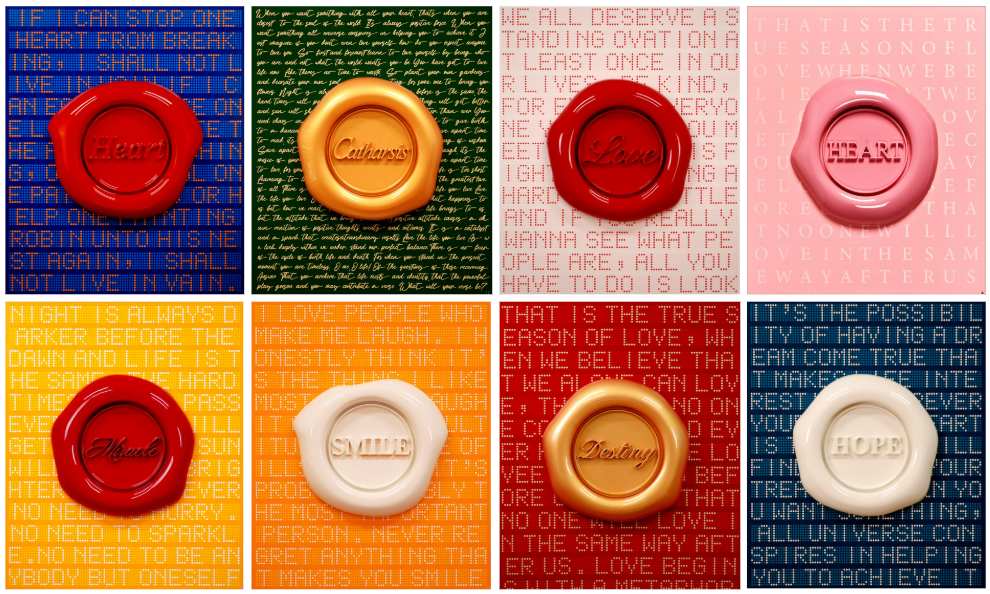 캔버스 위에는 텍스트가 배경을 이루고, 그 위로 도장을 찍은 듯한 입체 인장이 자리합니다. 도장 형상의 시각 요소는 단순한 장식이 아니라, 감정의 종결이자 승인, 기록을 의미합니다. 'LOVE', 'HOPE', 'HEART', 'DESTINY'와 같은 단어는 중세 문서의 봉인을 현대적으로 재해석한 형태로, 익숙한 낱말을 통해 작화의 의도를 더욱 명확하게 전달함과 동시에 많은 사람들이 공감할 수 있도록 합니다.