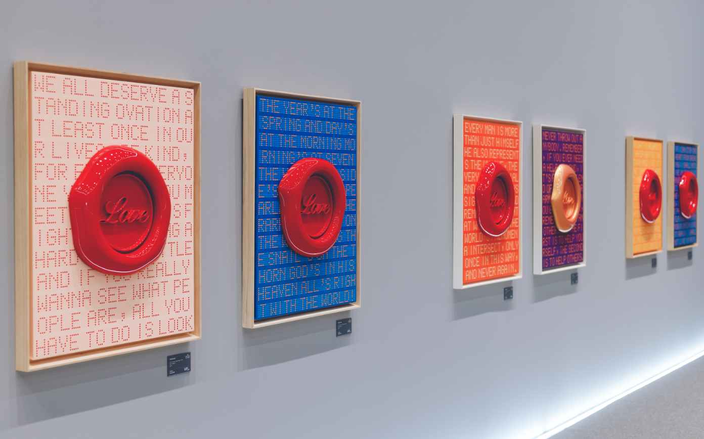 인장 뒤로 보이는 텍스트들엔 괴테, 니체, 오드리 햅번, 피카소 등 역사적 인물들의 명언과 책의 글귀가 새겨져 있습니다. 이를 테면, 핑크작품의 하트 뒤에는 생텍쥐페리의 어린왕자 내용이 패터닝 되어 있습니다.