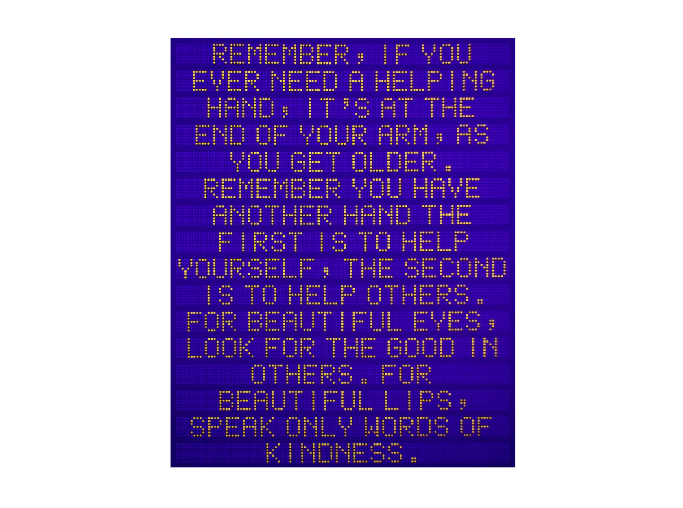 여러분들은 이 작품을 보면 어떤 이미지가 떠오르나요? 마치 도심 속의 전광판이 떠오르진 않나요? 작가는 '좋은 문장들을 많은 사람들과 나누고 싶다'는 마음에서 이 시리즈를 기획했습니다. 일정하게 정렬된 도트 폰트와 LED 디스플레이를 연상시키는 형상은 빛처럼 반짝이는 언어의 에너지를 시각적으로 형상화 합니다. 아래 문장을 한번 같이 보실까요?
