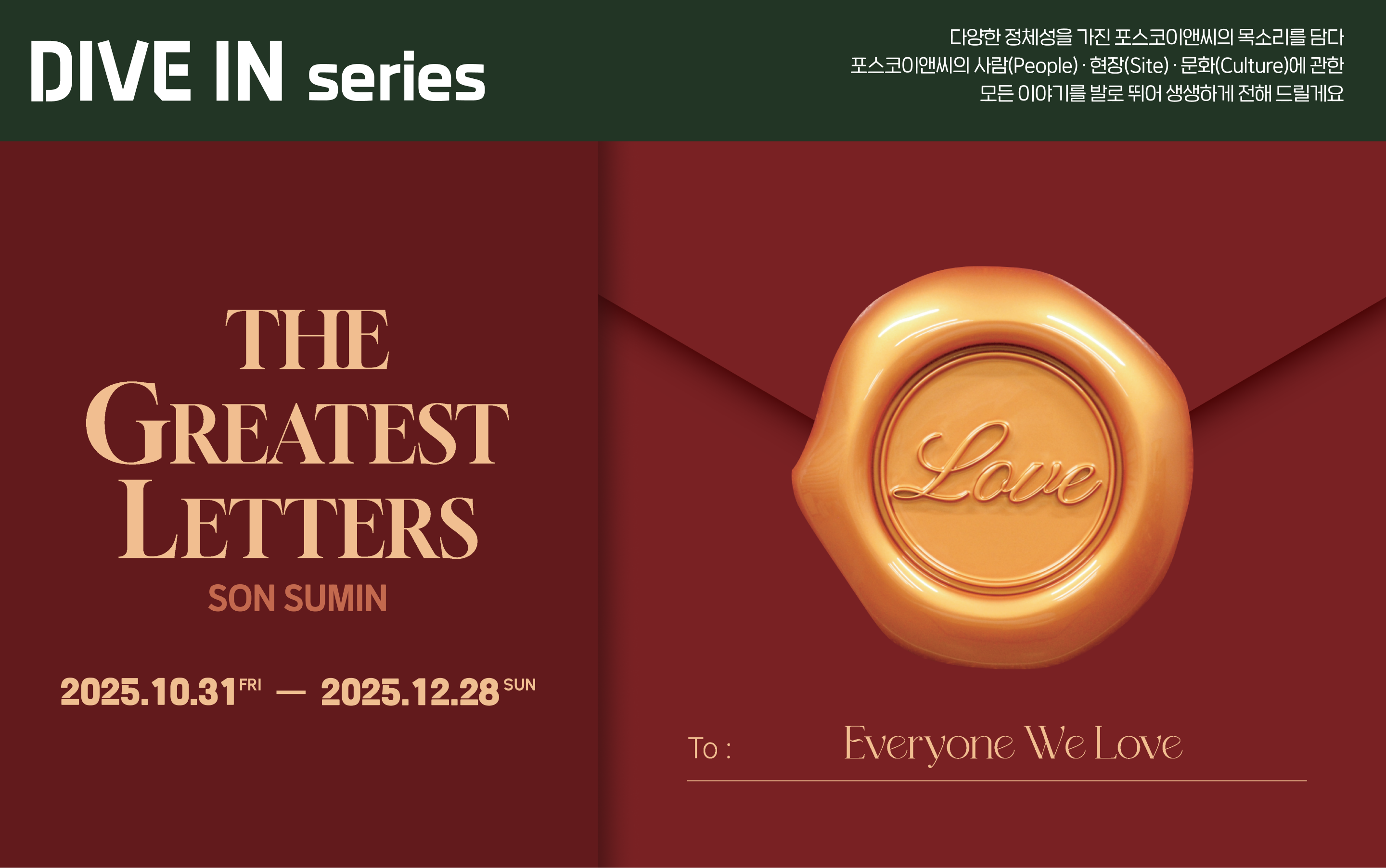 12월 28일까지 더샵갤러리에서 진행되는 손수민 작가의 'THE GREATEST LETTERS'전에서, 손수민 작가는 언어를 감정의 '그릇'으로 삼아서 말과 글 속에 담긴 따뜻한 메시지를 시각적으로 전합니다. 2025년 연말을 맞아 한 해를 되돌아보기 좋은 시기 기획된 이번 전시가 여러분의 마음에 따뜻한 공간으로 머물기를 희망하며 포스코이앤씨의 복합문화공간 '더샵갤러리'로 여러분을 초대합니다.