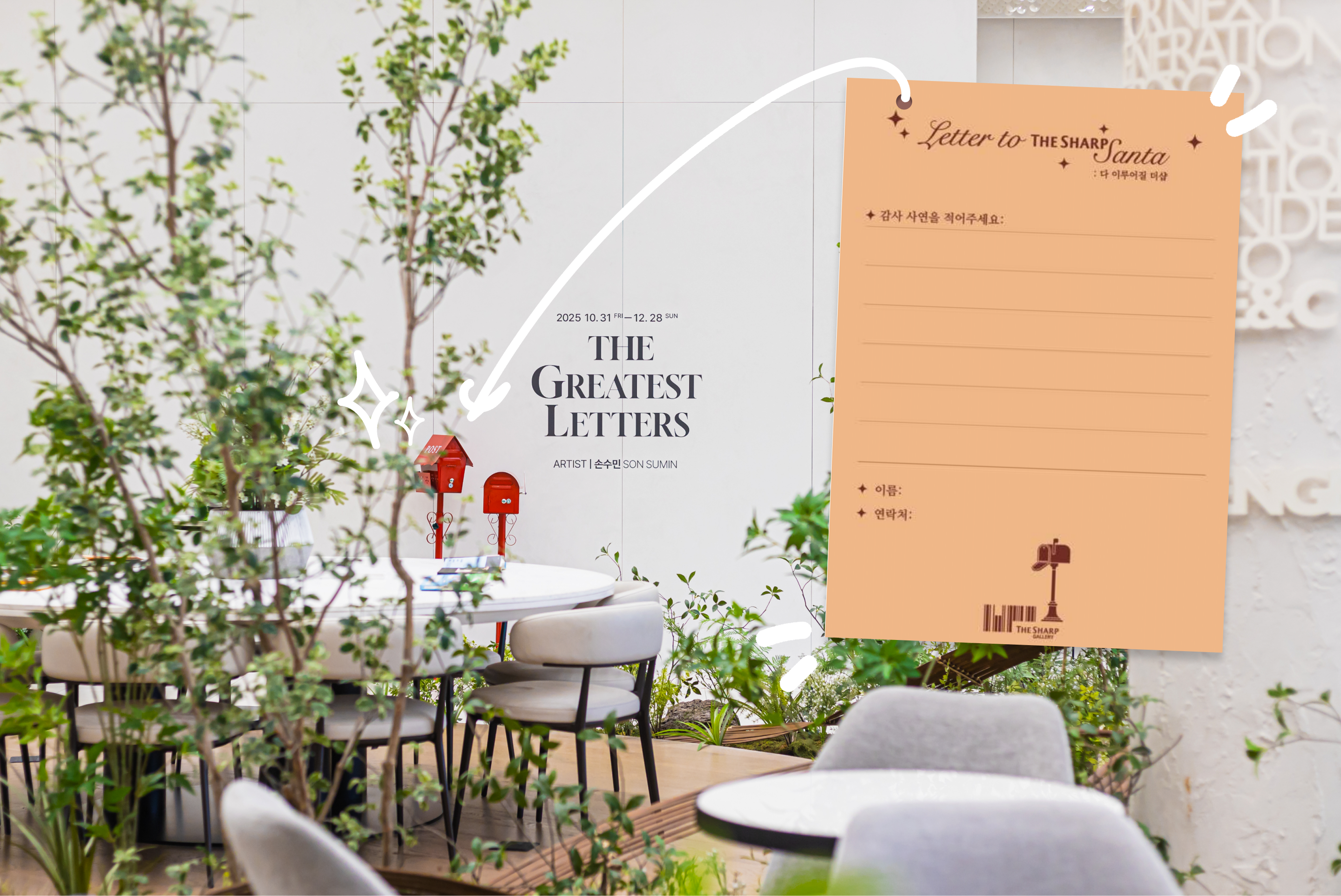 전시를 입장할 때 받은 감사 사연 카드는 2025년 한 해 감사했던 사람들에게 소중한 감사 인사를 전하는 사연을 적어, 전시장 바깥에 놓인 빨간 우체통에 넣어보세요! 추첨을 통해 특별한 시간을 나눌 수 있는 호텔 식사권을 선물로 제공한다고 하니, 소중한 이벤트 또한 놓치지 마시길 바랍니다 😉