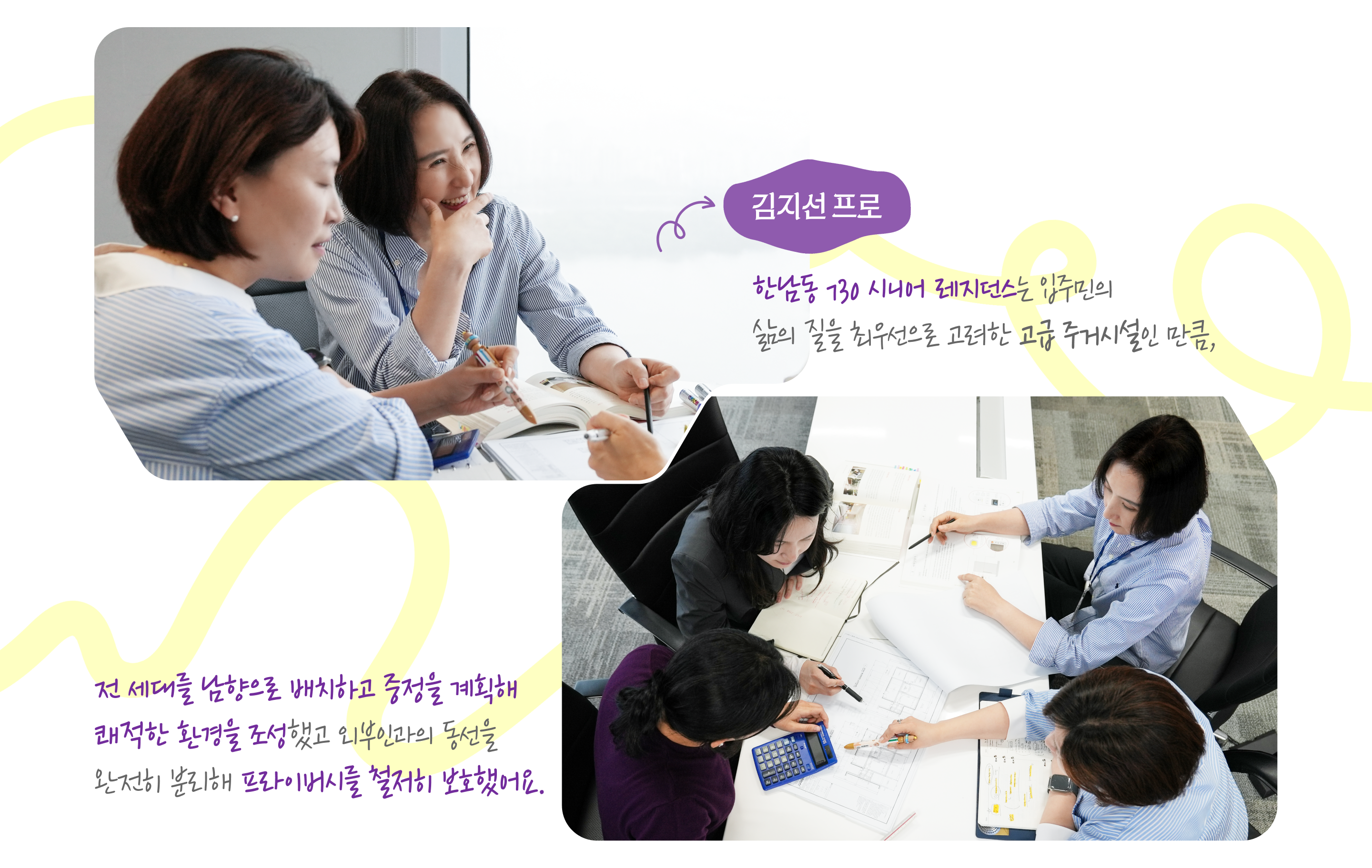 정소현 대리: 사실 시니어 레지던스가 기존 분양 사업과 달리 임대 기반의 노인복지주택이라 제도적 제약이 많아 사업성을 갖춘 모델을 찾기가 쉽지 않았어요. 하지만 포기하지 않고 사업성 확보 전략과 프로젝트 발굴 기준을 정비하며 방향성을 명확히 했습니다. 이러한 준비 과정 속에서 한남동 730번지 프로젝트를 만나고, 시행사가 제안한 ‘시공사의 운영 참여’ 모델이 저희가 지향하는 신사업 방향성과 정확히 맞아떨어져 결국 공동의 목표를 향해 함께 나아가는 파트너십을 구축할 수 있었습니다.