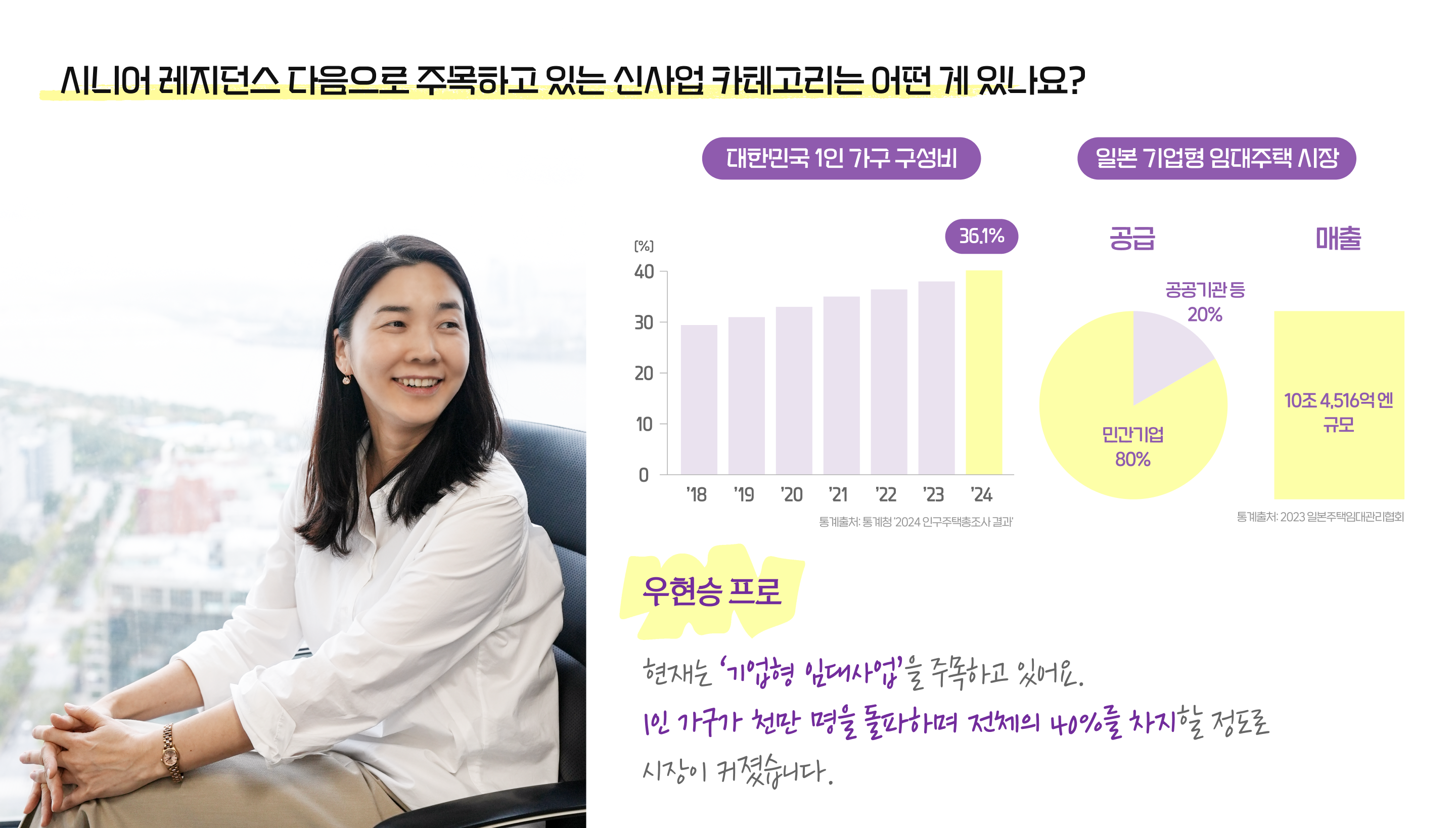 우현승 프로: ‘기업형 임대사업’을 주목하고 있어요. 2024년에 1인 가구가 천만 명을 돌파하며 전체 세대의 40%를 차지할 정도로 시장이 커졌습니다. 자가보단 임대를, 전세보단 월세를 선호하는 흐름이 뚜렷해지고 있어요. 이런 흐름은 일본처럼 임대 시장이 거대한 산업으로 발전할 가능성이 높아서 본격적인 사업 진출을 위해 준비하고 있습니다.
