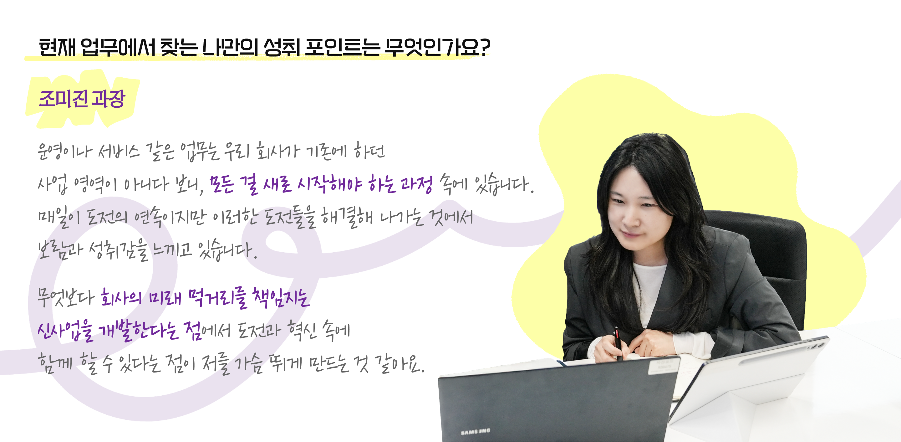 성홍준 섹션리더: 신사업개발섹션은 회사 미래 먹거리 발굴을 위해 새로 만들어진 팀입니다. 다양한 전공과 경력을 가진 사람들이 ‘새로운 길을 만들어보자’는 의지로 뭉쳤죠. 집단지성으로 시너지를 내며 미래 사업을 개척해가고 있죠. 단순한 시공을 넘어 운영·서비스 경쟁력까지 확보해, 운영 수익과 매각 차익을 창출하는 비즈니스 모델을 목표로 하고 있습니다. 향후에는 당사 운영법인 설립도 고려하고 있습니다.