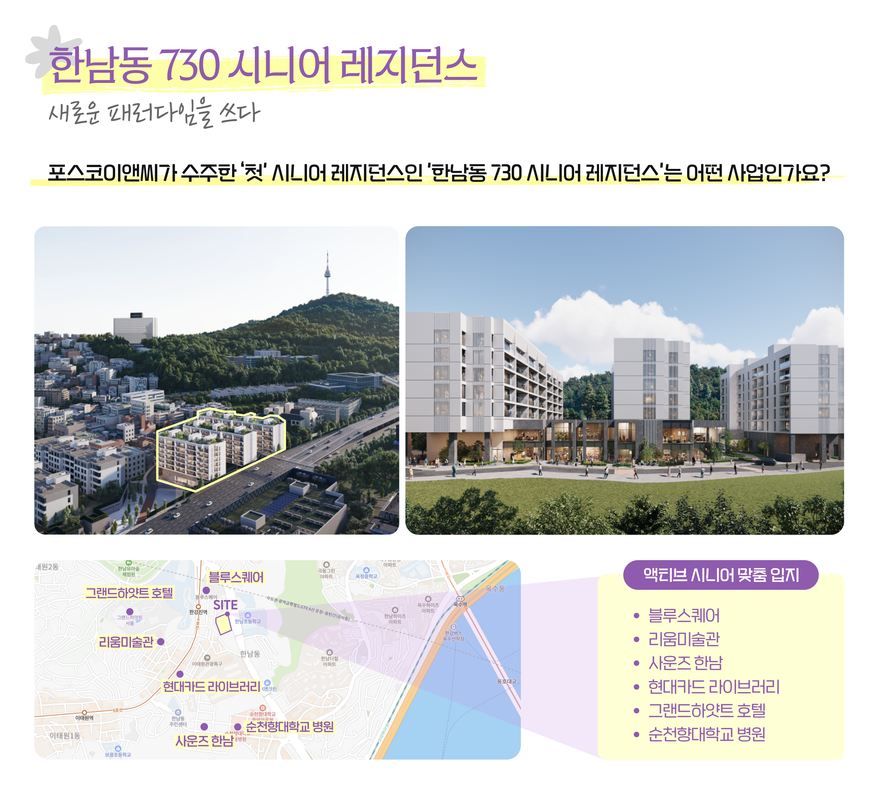 김선 프로: 한남동 730 시니어 레지던스는 말 그대로 '한남동 730번지'의 최고급 주거지에 들어서는 하이엔드 시니어 주거시설이에요. 연면적 3만9천㎡, 지하 5층~지상 7층 규모에 시니어 레지던스 116세대가 들어설 예정이고, 액티브 시니어*를 위한 건강관리, 웰니스, 여가 프로그램 등 맞춤형 주거 서비스가 제공됩니다. 호텔식 주거 서비스와 헬스케어를 결합한, 국내 최고 수준의 시니어 레지던스라 할 수 있습니다.