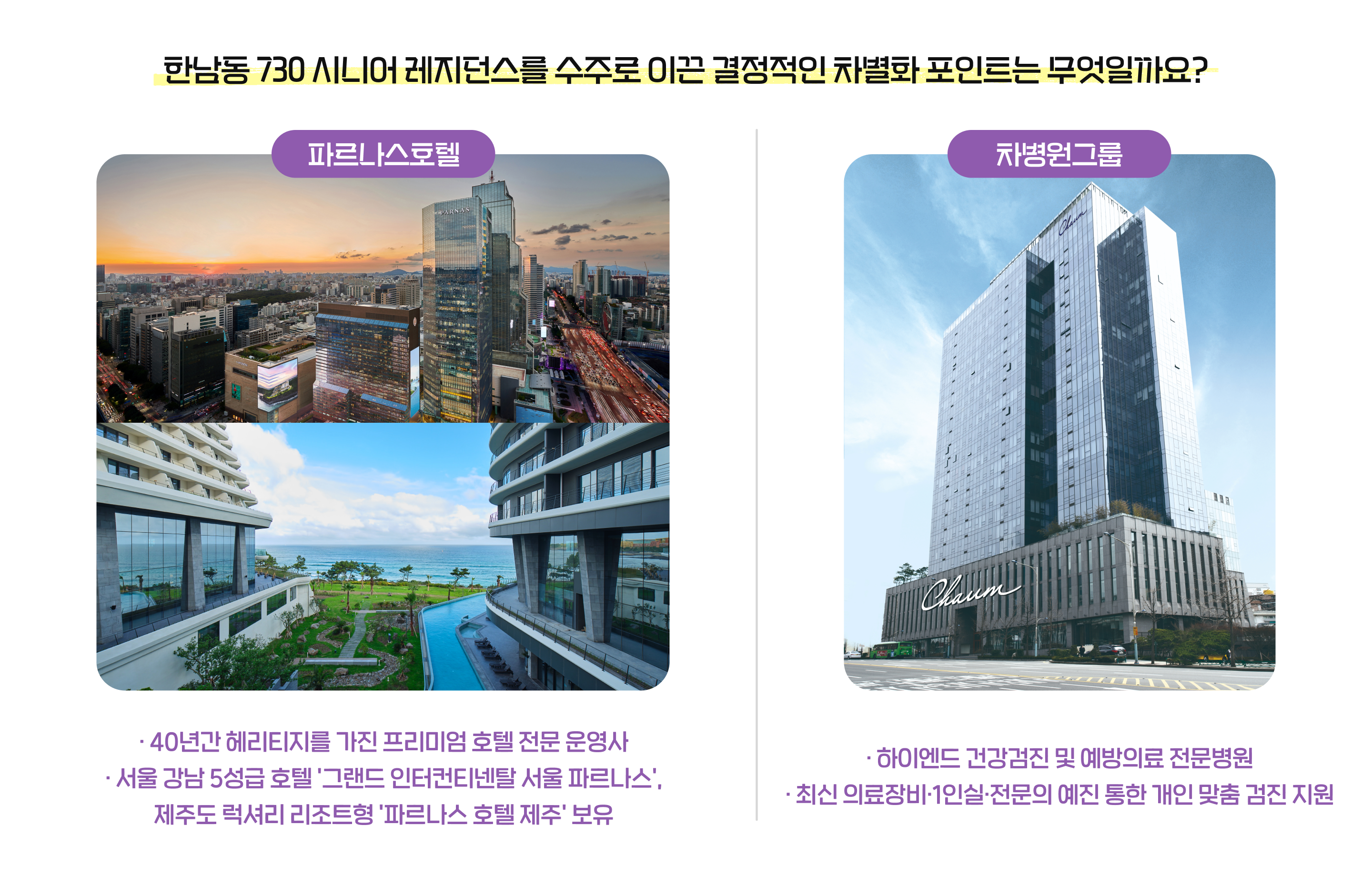 이현정 프로: 우선, ‘시니어를 위한 하이엔드 서비스’라는 콘셉트를 구체화한 점이 컸습니다. 국내 최초로 5성급 호텔인 '파르나스 호텔'과 협약을 맺었고, 순천향대학병원 등과는 건강검진 서비스 제공을 위한 MOU를 체결하였으며 하이엔드 건강검진 및 예방의료, 안티에이징 분야의 ‘차움의원’ 및 ‘차헬스케어’와 웰니스·메디컬 협력 논의를 진행 중입니다. '시니어'를 위한 전문 특화 서비스와 '레지던스'의 필수 서비스를 해당 분야 국내 최고 기업들과 협업해 이례적인 하이퍼엔드 시니어 레지던스로 포지셔닝한 것이 가장 큰 차별점이라 생각합니다.